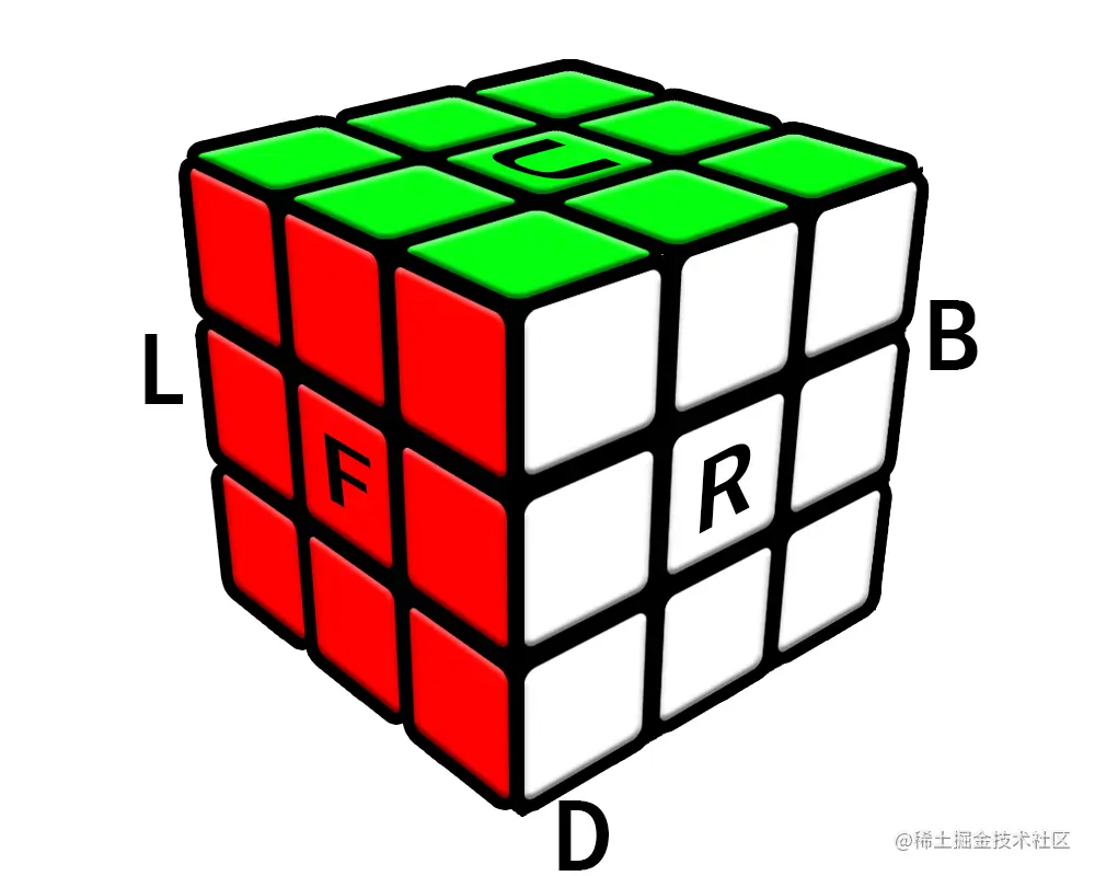 三阶魔方有 个面,或者整体来看有 上下左右前后 6 个面,为做区分,这里称为层。上下左右前后 6 个面/层分别命名为 U, D, L, R, F, B,也就是对应英文单词的首字母,看下图,3D 图画得很烂还请见谅