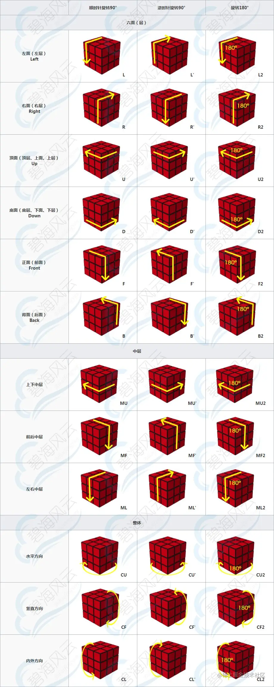 在本列些文章里只用到前 6 行 的18 种基本转动,也就是不予考虑后面的中层转动和体转,体转会用到部分,在下篇讲算法种用到。在研究魔方一般不予考虑中心块的位置和中间层的转动,将 6 个中心块的位置视为不变作为参考系,而中间层的转动是可以用其他两层的转动来替代的,所以两者都不予考虑变化。