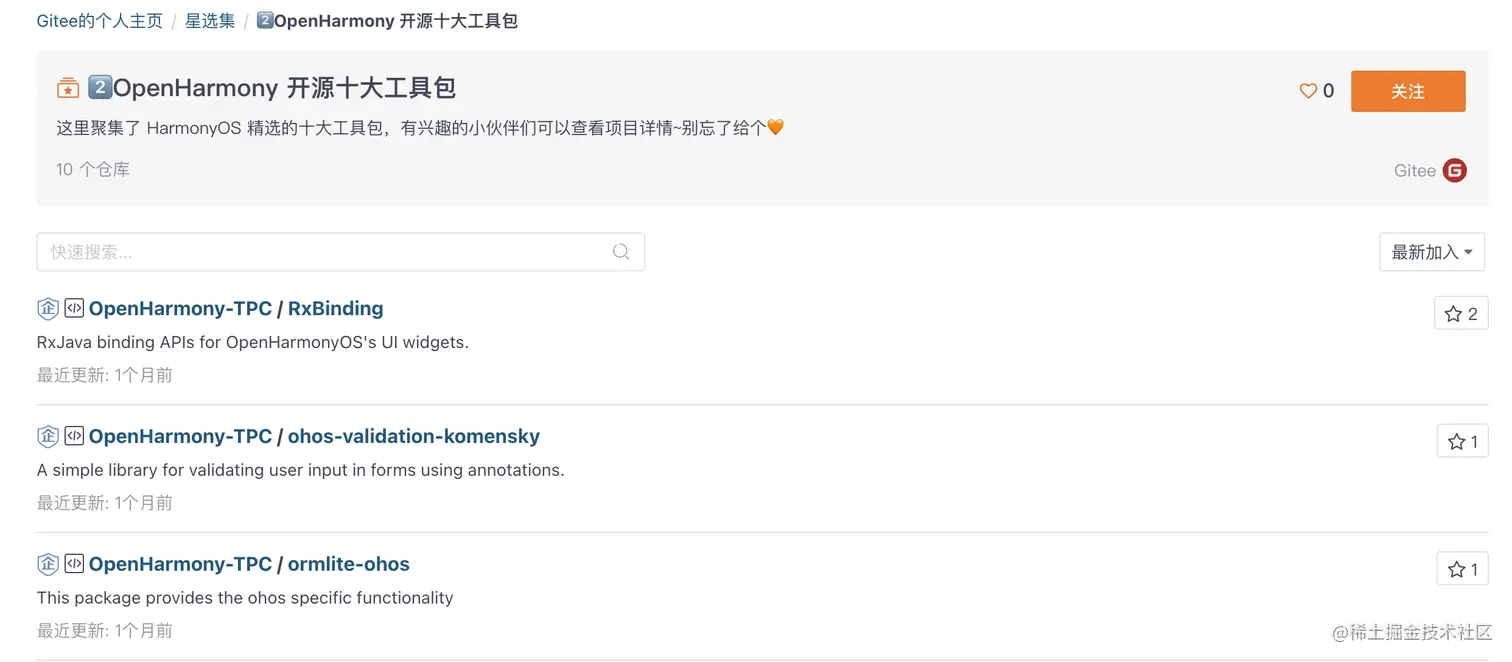 在该页面中,你可以看到 Gitee 上所有与 OpenHarmony 相关的开源项目,系统组件、应用、教程及各种工具包。