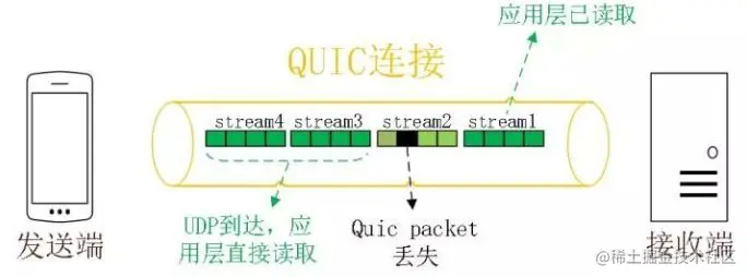 例如下图,stream2 丢了一个 UDP 包,不会影响后面跟着 Stream3 和 Stream4。这样的技术就解决了之前 TCP 存在的队头阻塞问题。