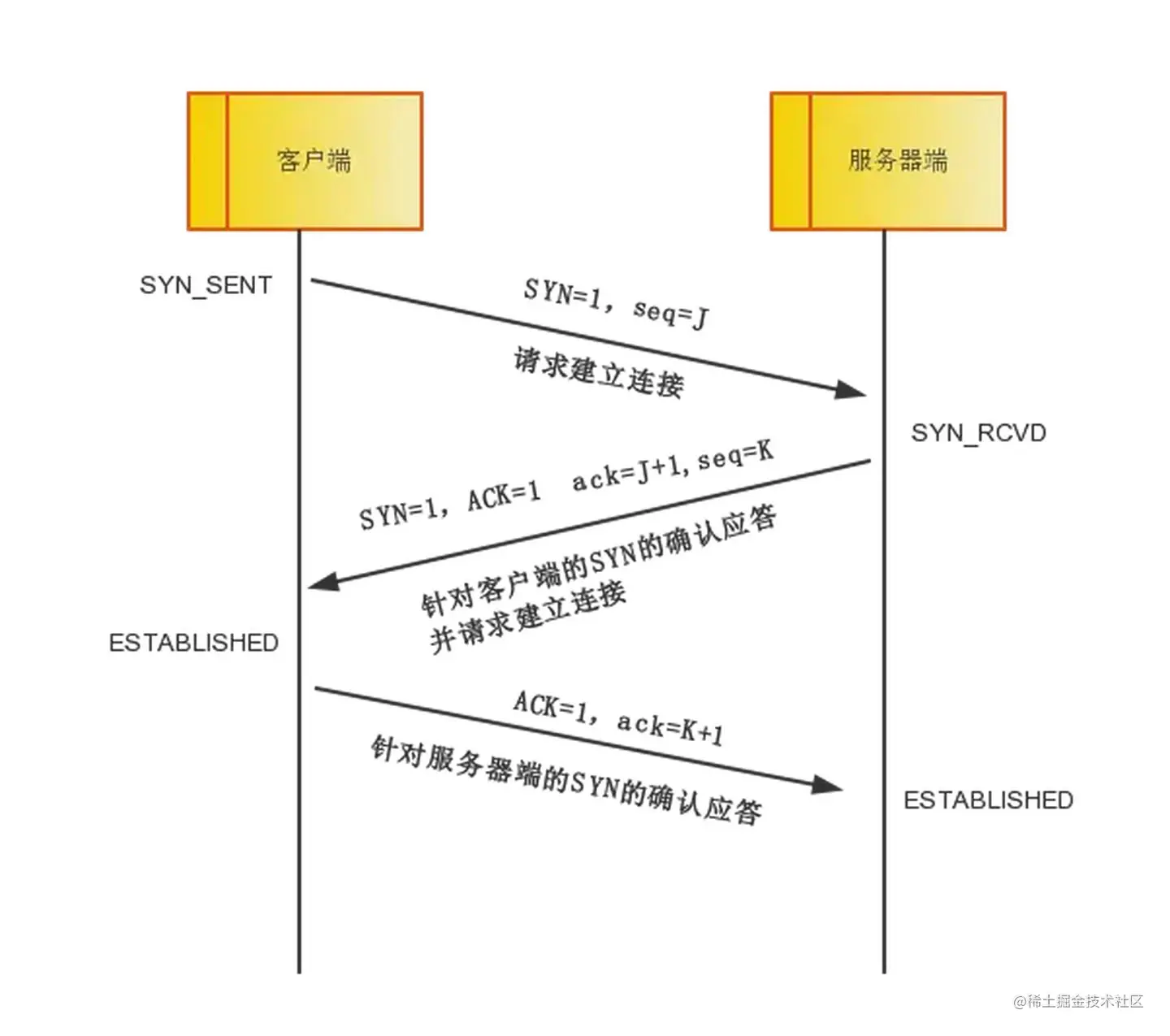 - 三去 (ACK):当客户端收到连接同意的应答后,还要向服务端发送一个确认报文。客户端发完这个报文段后便进入 ESTABLISHED 状态,服务端收到这个应答后也进入 ESTABLISHED 状态,此时连接建立成功