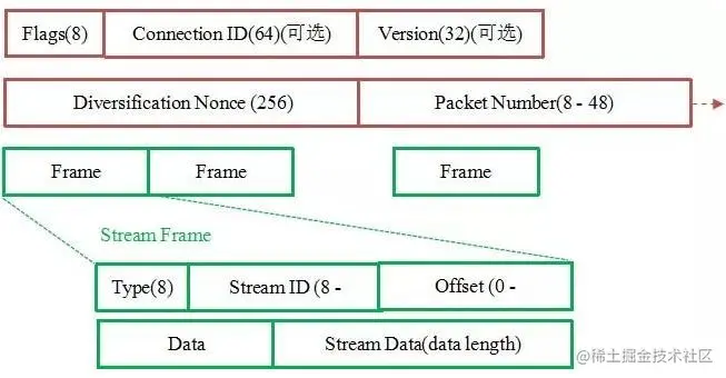 如上图所示,红色部分是 Stream Frame 的报文头部,有认证。绿色部分是报文内容,全部经过加密。