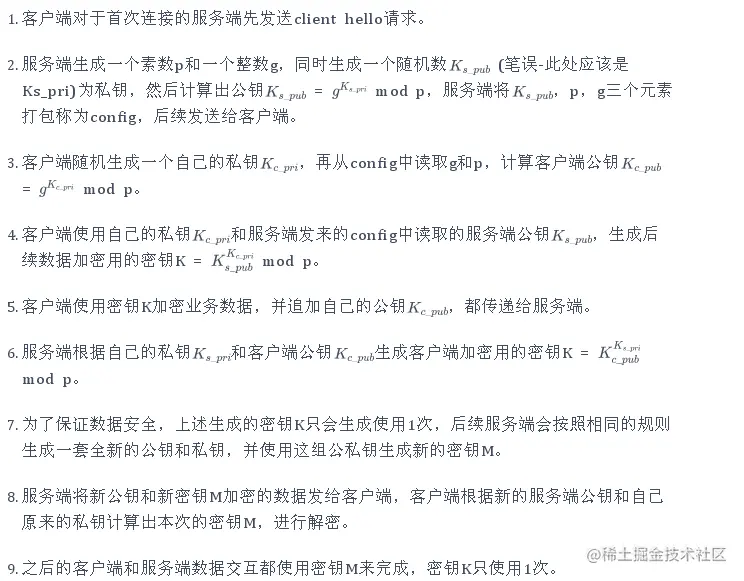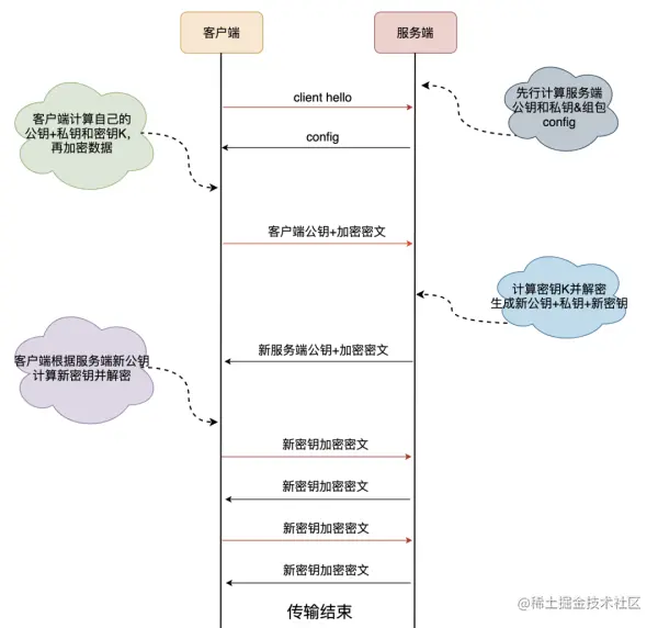 - 四回: 服务端收到加密过的随机值并使用私钥解密获得第三个随机值,这时候两端都拥有了三个随机值,可以通过这三个随机值(C/S 加 pre-master 算出主密钥)按照之前约定的加密方式生成密钥,接下来的通信就可以通过该会话密钥来加密解密