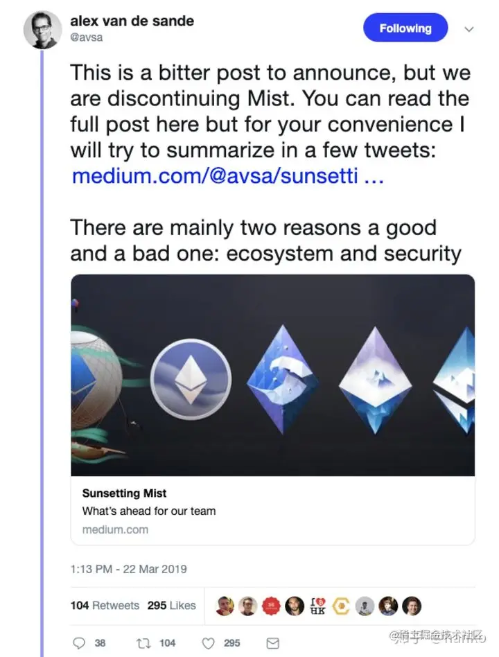 2019年3月31日更新: 2019年3月22日,Alexandre Van de Sande 在 twitter 上宣布:mist 钱包停止维护。 从2015年9月17日 mist 团队发布第一版开发者先行版到现在,已经过去了3年半的时间了。mist 的退出意味着现在以太坊生态的成功(有各种各样能够较好的兼顾安全性和便捷性的钱包供大家选择),也意味着 mist 团队在技术选择上的失败(存在安全性漏洞)。Alexandre Van de Sande 在 mist的日落 一文中很完整的表达了 mist 团队复杂的情绪和心路历程,值得后来者一看。新兴行业的先行者很多时候当然不一定能笑到最后。他们退出了舞台,但是他们的贡献与失败都值得被我们记住。所以虽然下文第一款提到钱包已经没有未来了,但是还行希望大家能够了解这一款在以太坊历史上颇具象征意义的钱包。mist 不仅简陋而且很慢,但是这就是以太坊生态最初的样子。