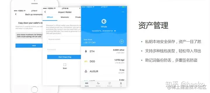 移动端钱包,操作简便,容易上手,功能齐全,在imToken上生成的钱包私钥保存在手机本地,平台方并无备份。