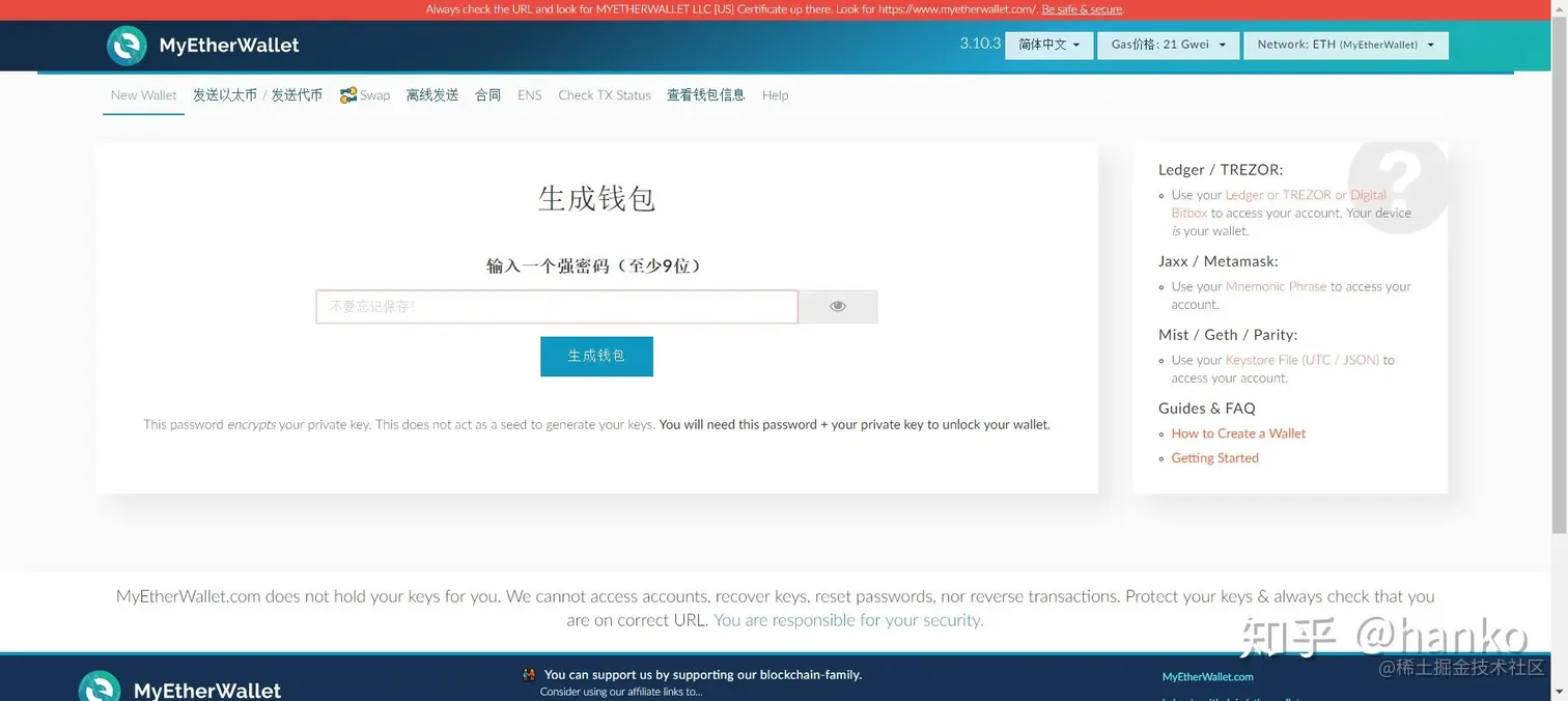 MyEtherWallet 作为一个轻钱包,上手难道不大,无需下载,在直接在网页上就可以完成所有的操作。在MyEtherWallet上生成的私钥由用户自我保管,平台方并无备份。