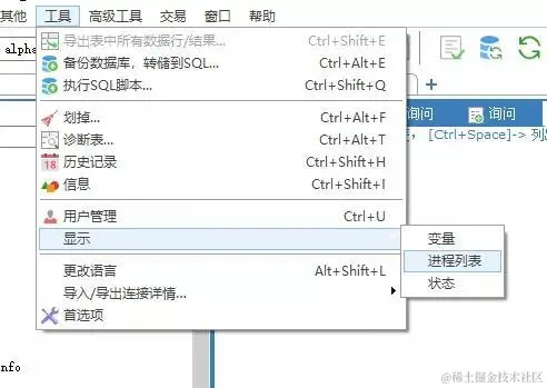 如果你使用的sqlyog,那么也有图形化的页面,在菜单栏-工具-显示-进程列表。在进程列表页面可以右键杀死进程。如下所示: