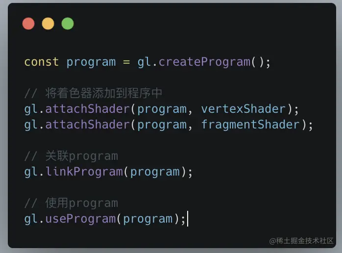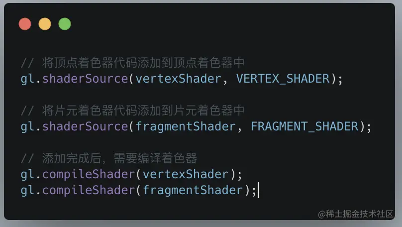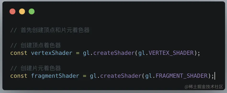 gl.createShader()创建了两个着色器。传入不同的参数即可创建不同的着色器。创建并关联着色器的步骤比较复杂。当你熟悉这个过程之后,可以将这个过程的代码封装起来作为备用。 -