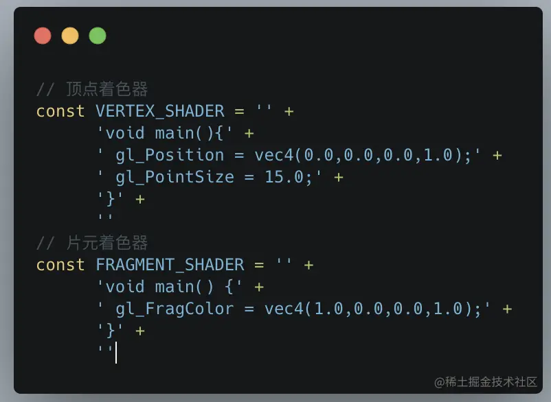 获取到绘图上下文之后,我们需要初始化WebGL 的着色器了,着色器代码是以字符串的形式嵌入到渲染程序中,所以我们需要编写两个着色器的字符串。