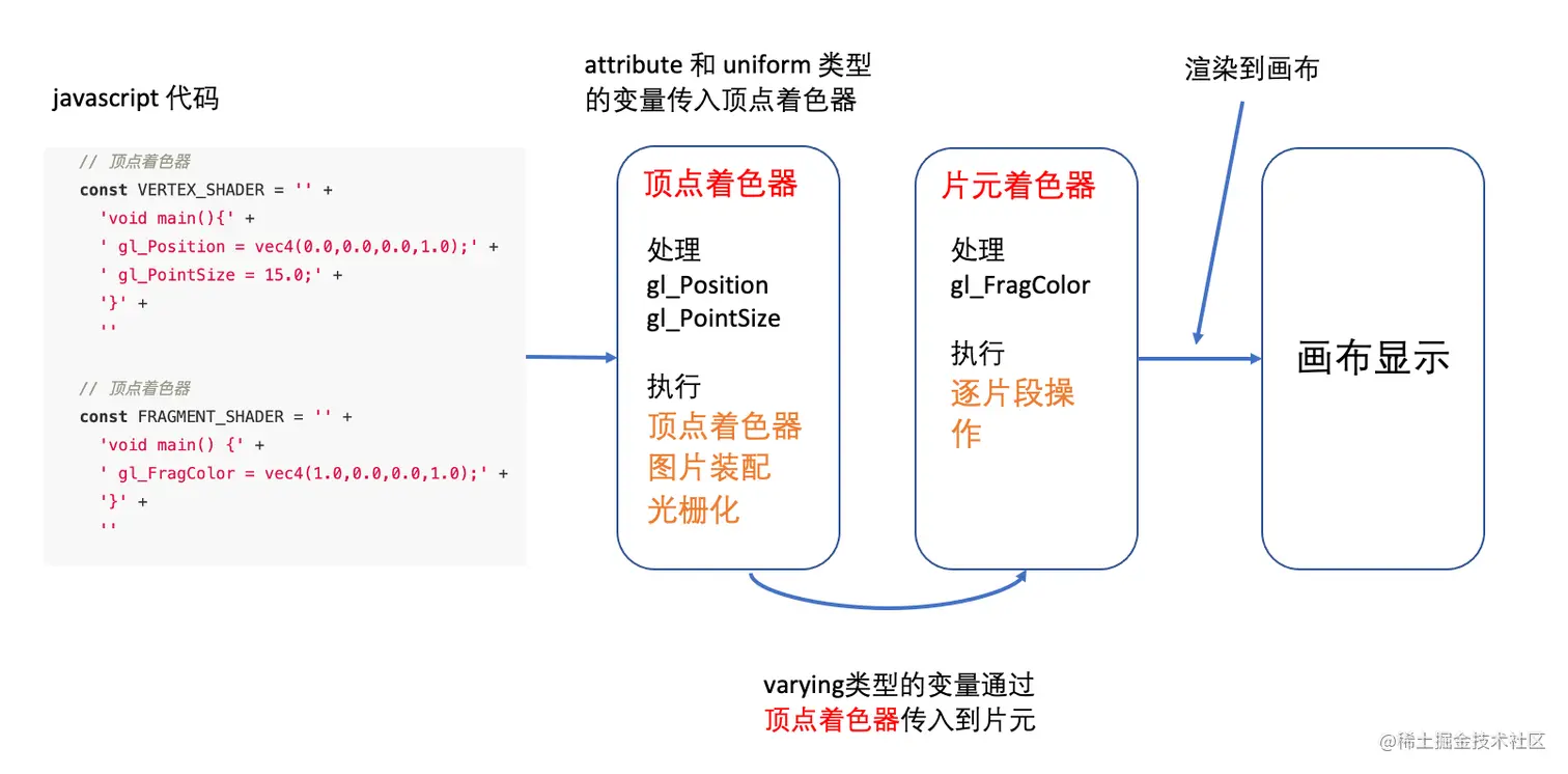 像 attribute 这个变量之前我们就用到过,用来设置了顶点的位置和大小。 回顾一下