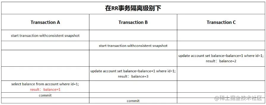 举例说明:仍然以上述RR隔离级别下三个ABC事务为例