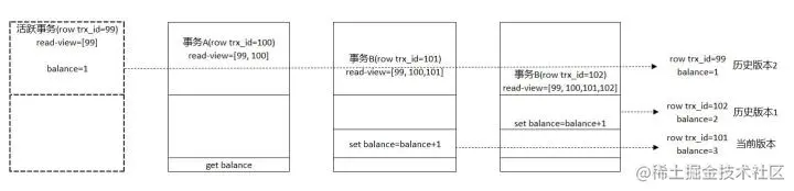 第二个有效更新版本是事物B,更新balance=3,这个时候最新版本row trx_id=101,而此时row trx_id=102成为历史版本1,而row trx_id=99成为历史版本2;