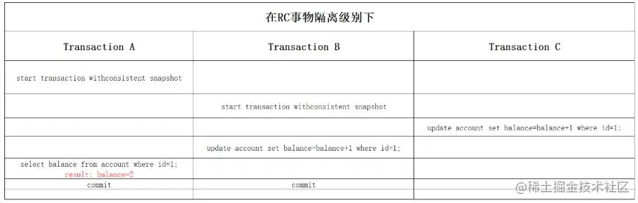 同样地,我们在RC隔离下,开启事务ABC,观察事务A最后的balance结果。