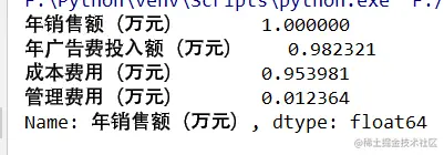 result = df.corr()['年销售额(万元)'] # 计算年销售额与其他变量之间的皮尔逊系数