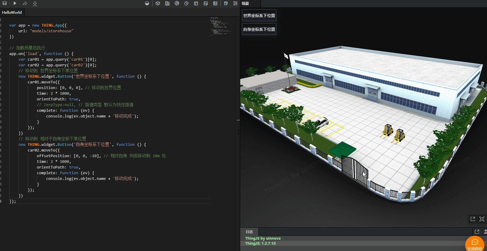我阅读文档中心后发现ThingJS提供了moveTo设置一个移动动画,rotateTo 设置一个旋转动画,scaleTo 设置一个缩放动画,用 movePath 可设置让物体沿一条路径移动等方法。旋转和缩放上篇文章已经实现了,下面我用moveTo 实现将3D可视化场景中物体移动到某个目标位置。