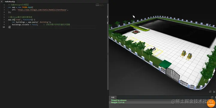 // 加载ThingJS示例园区var app = new THING.App({ url: 'https://www.thingjs.com/static/models/storehouse', }); //通过load事件加载场景信息app.on('load', function() { var buildings = app.query('.Building'); buildings.visible = false; // 获取场景内所有的建筑并隐藏})