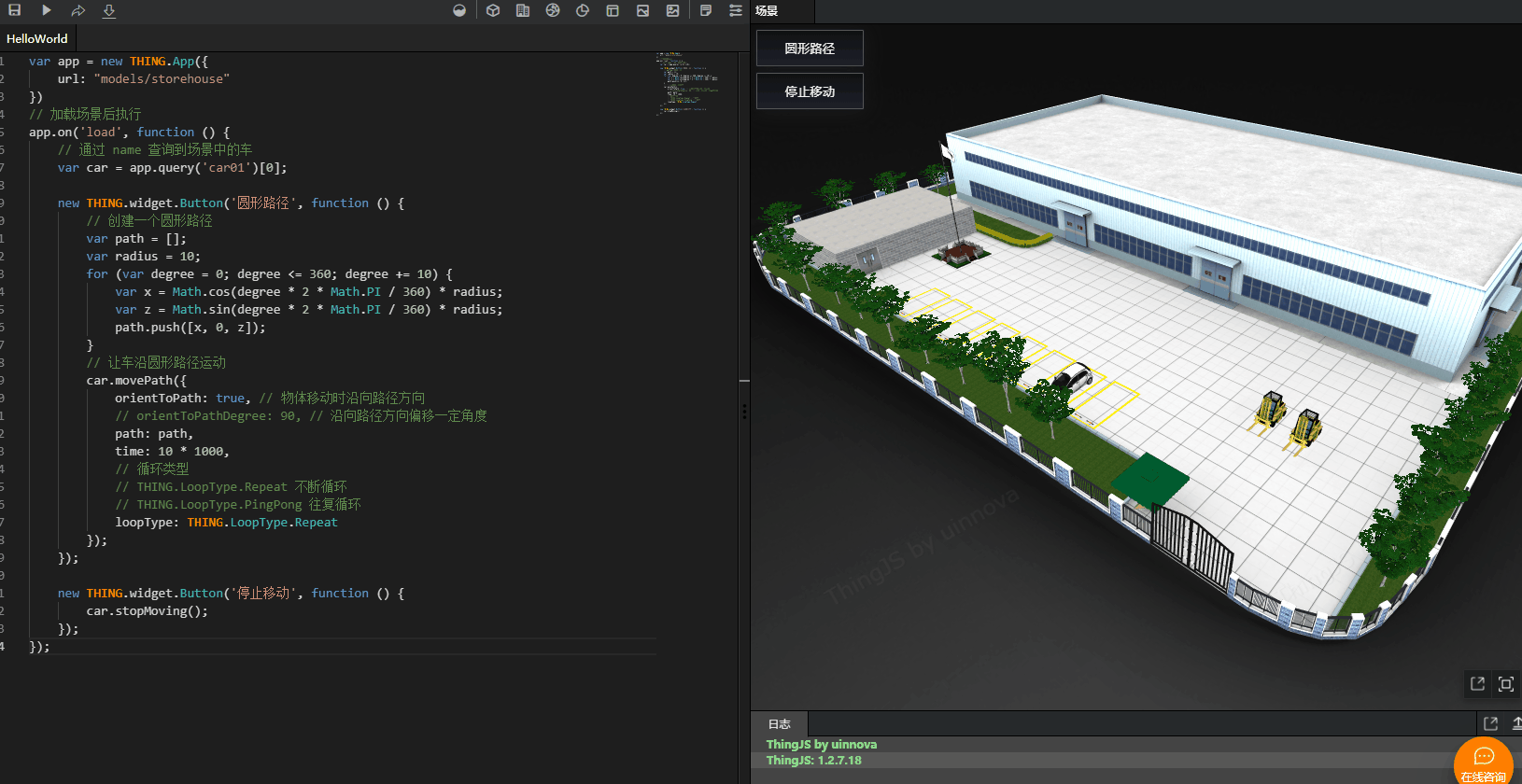 var app = new THING.App({ url: "models/storehouse"})// 加载场景后执行app.on('load', function () { // 通过 name 查询到场景中的车 var car = app.query('car01')[0]; new THING.widget.Button('圆形路径', function () { // 创建一个圆形路径 var path = []; var radius = 10; for (var degree = 0; degree <= 360; degree += 10) { var x = Math.cos(degree * 2 * Math.PI / 360) * radius; var z = Math.sin(degree * 2 * Math.PI / 360) * radius; path.push([x, 0, z]); } // 让车沿圆形路径运动 car.movePath({ orientToPath: true, // 物体移动时沿向路径方向 // orientToPathDegree: 90, // 沿向路径方向偏移一定角度 path: path, time: 10 * 1000, // 循环类型 // THING.LoopType.Repeat 不断循环 // THING.LoopType.PingPong 往复循环 loopType: THING.LoopType.Repeat }); }); new THING.widget.Button('停止移动', function () { car.stopMoving(); });});