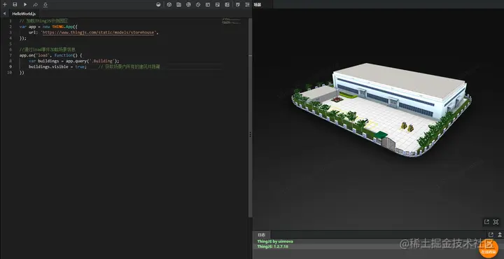 运行项目后,ThingJS 示例园区中的建筑将被隐藏,如果将 visible 属性值 false 改为 true 后,建筑将显示出来。批量控制对象很有意思,上面我已经学习了控制3D可视化场景中物体移动,那么通过批量控制对象是不是可以实现3D可视化场景中多辆车自动泊车的效果呢?等我深入学习后可以试着实现一下。