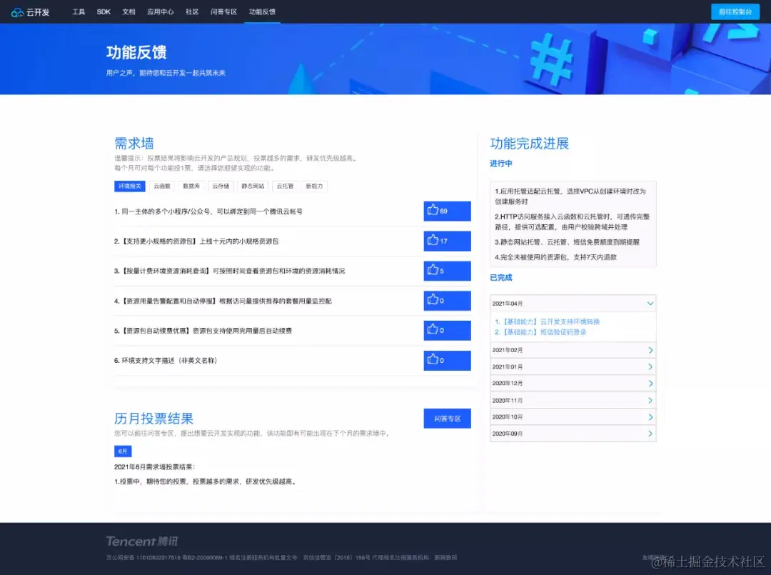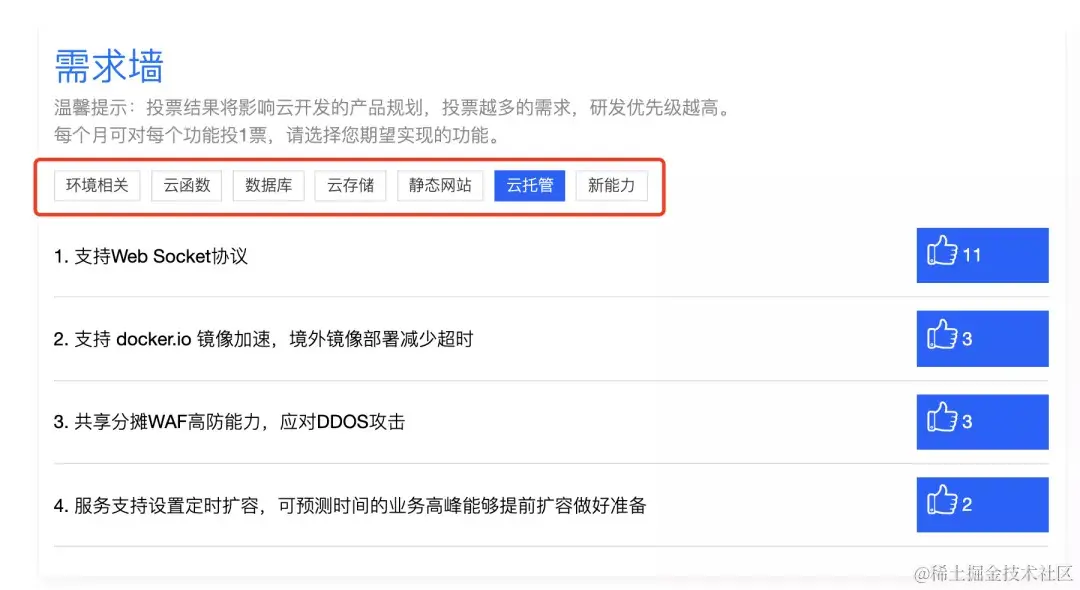 您可以切换不同功能 Tab 页,选择您最期望的功能投上宝贵的一票,获得高赞的需求将被云开发团队优先评估!每项功能仅能投一次哦~