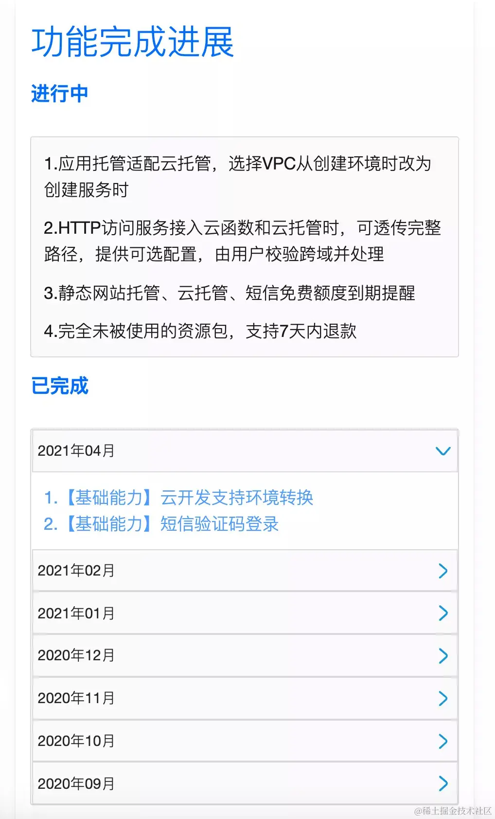在这里,可以一览云开发 正在开发中的功能 和 以往每月更新的能力。