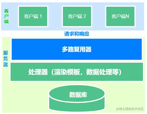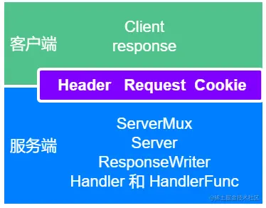 客户端 请求 服务器,服务器里面使用 net/http包,包中有多路复用器,和对应多路复用器的接口,服务器中的多个处理器处理不同的请求,最终需要落盘的数据即入库