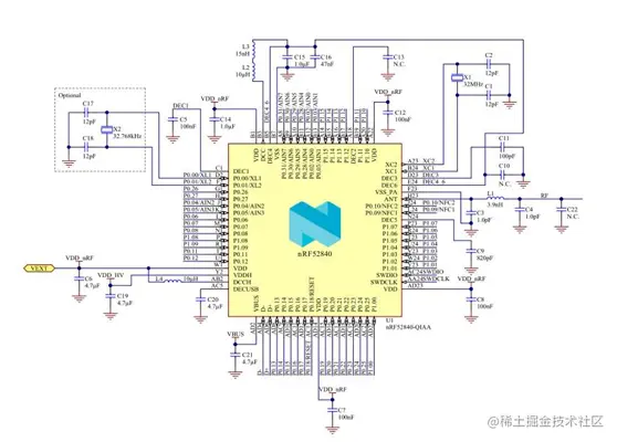 以上是nordic官方提供蓝牙最小系统原理图,这里需要特别强调的是这颗芯片供电方式。52840内部集成了高性能的电源管理芯片PMU和电压调节器。