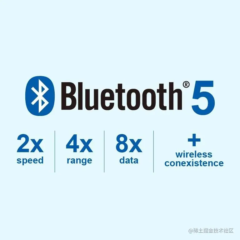 最重要的是支持范围更广(与蓝牙4.x相比最多可达x4),空中数据速率翻了一番,从蓝牙4.x中的1Mbps提高到2Mbps。