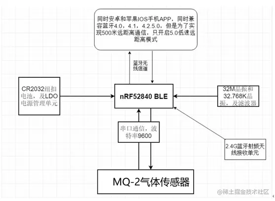 nRF52840气体传感器上面集成了MQ-2气体传感器,可以用来检测工业区和居民小区周围可能泄露的可燃性气体,然后通过串口通信把气体数据传输给nRF52840芯片,然后nRF52840芯片通过蓝牙5.0数据帧把气体数据按照一定的格式广播出去,手机APP或者蓝牙报警设备就可以随时检测到气体数据,并发出报警功能,从而避免更大的安全事故发生。