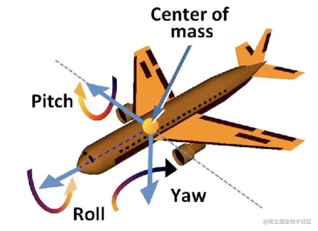 Rotation : 如下图所示,好比飞机的 pitch ,roll 与 yaw 旋转一般,物体可通过绕 x 轴,y 轴,z 轴旋转相应的角度,得到任意想要的形态。