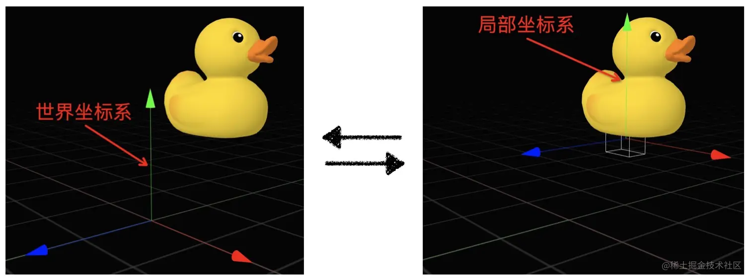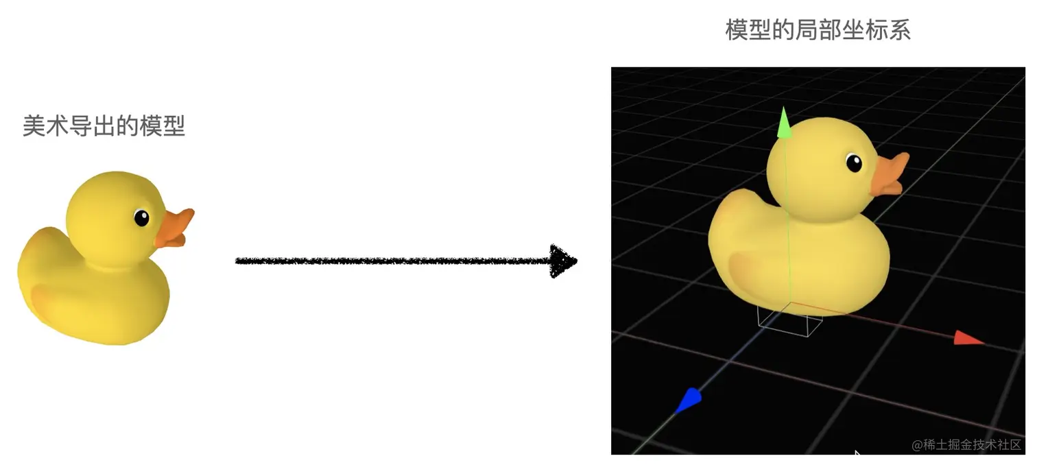 模型根据每个顶点的局部坐标确定其位置,局部坐标的参考坐标系便是鸭子模型自身定义的局部坐标系,任意移动鸭子模型时,鸭子模型上的各个顶点的局部坐标不会发生改变。