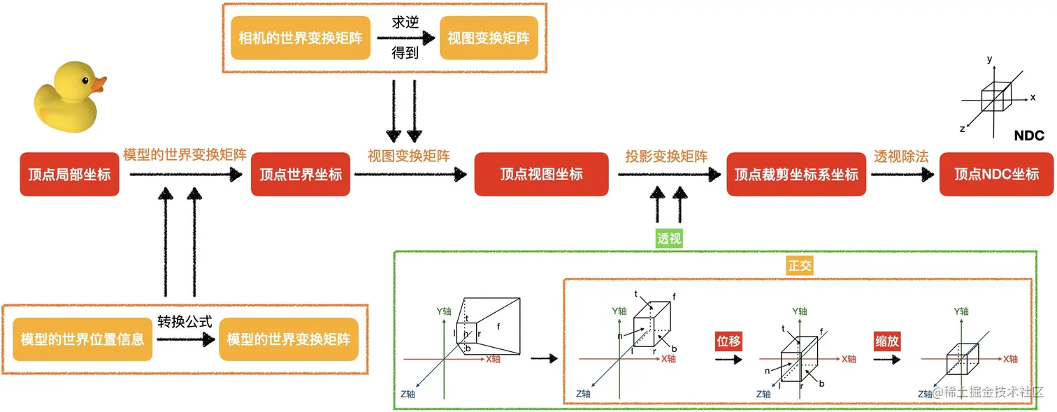 我们通过渲染一个小鸭模型去解释此变换,假设顶点 P 是小鸭模型上的一个顶点,且已知以下信息: