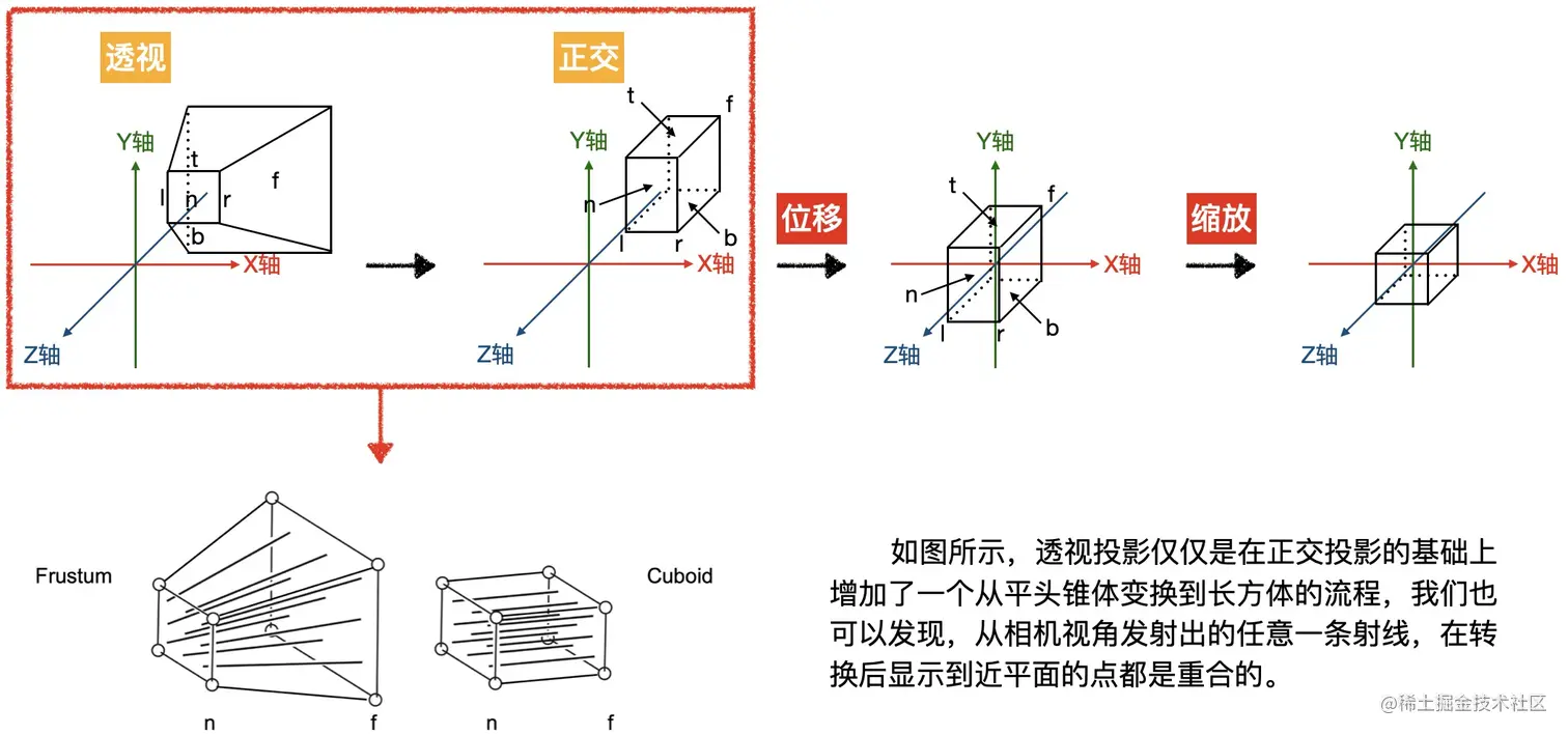 假设存在一个线性矩阵,可以将平头锥体的四个侧面向内压缩为长方体,可以发现下图左侧每条由相机发射出来的射线经过的所有点在相机看来都是重合的。