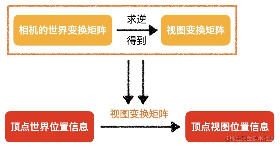 因为相机的世界坐标是已知的,所以我们可以得到相机的世界变换矩阵,因此相机变换至原点只需要执行世界变换矩阵的逆变换即可,也就是说视图变换矩阵就是相机世界变换矩阵的逆矩阵。