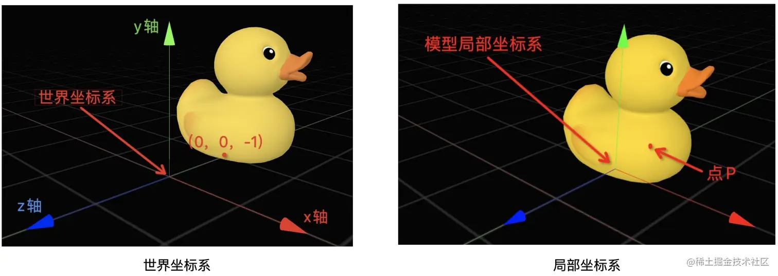 step1: 将小鸭模型移动至世界坐标系原点使局部坐标系与世界坐标系重合,则当前 P 点的局部坐标与世界坐标一致,可得到此刻 P 点的世界坐标: