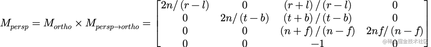 我们并不能直观确定矩阵第三行第三列与第四列的参数,所以代入两个特殊值 (0,0,-n,1) 和 (0,0,-f,1) ,可得: