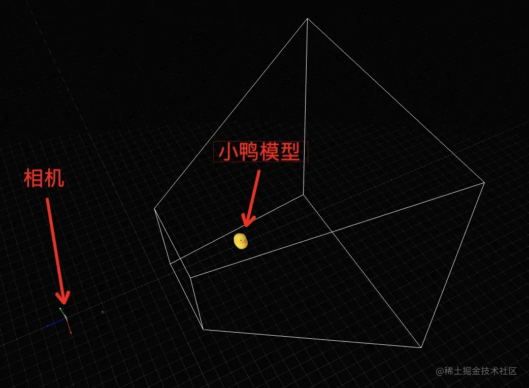 无论是透视相机还是正交相机,都可以得到一个密闭的空间,对于三维空间中的任意物体判断其是否会被渲染到屏幕上时,只需要检查他是否在此容器中或与此容器相交即可,如下图所示,为了正确渲染小鸭模型,我们将它放置在透视相机的视锥体内。