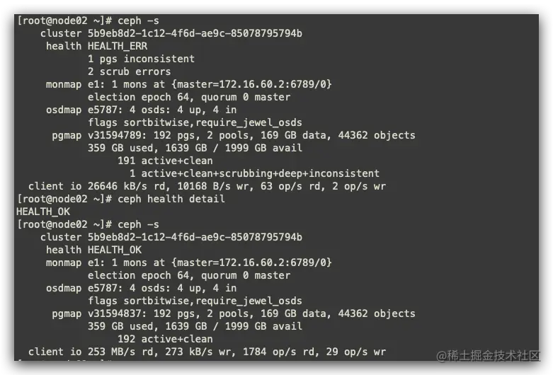 - 进行修复后,稍等一会,再次进行查看,ceph集群已经修复