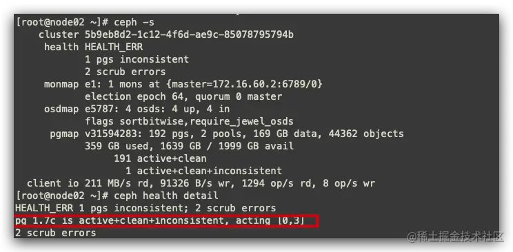 数据的不一致性(inconsistent)指对象的大小不正确、恢复结束后某副本出现了对象丢失的情况。数据的不一致性会导致清理失败(scrub error)。