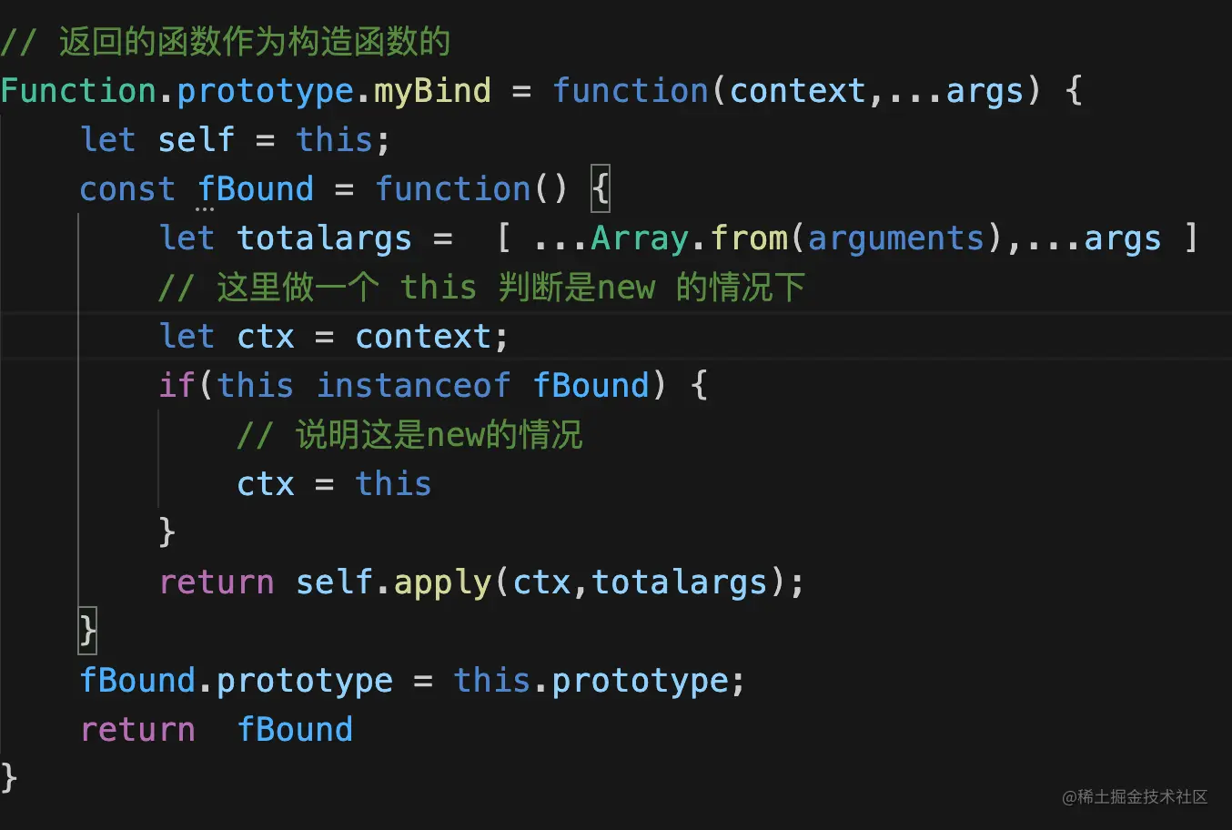 只要了解new 的实现原理, 才能对手写bind的才能理解。 其实就是我bind 一次this之后, 如果我将bind 返回的函数作为构造函数再去 new 的话。 因为new 也会改变 this, 所以这里做一个this 判断, 保证实例的属性不手影响。