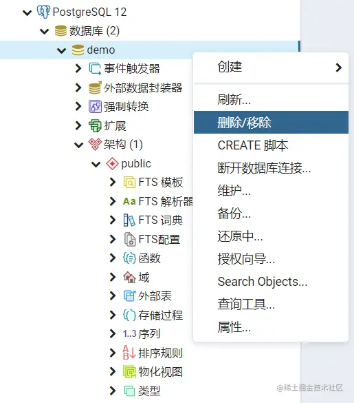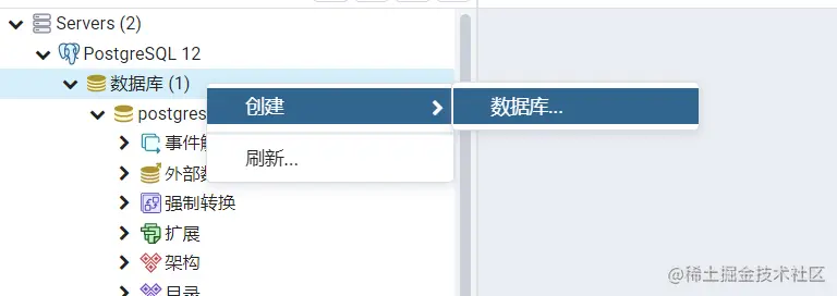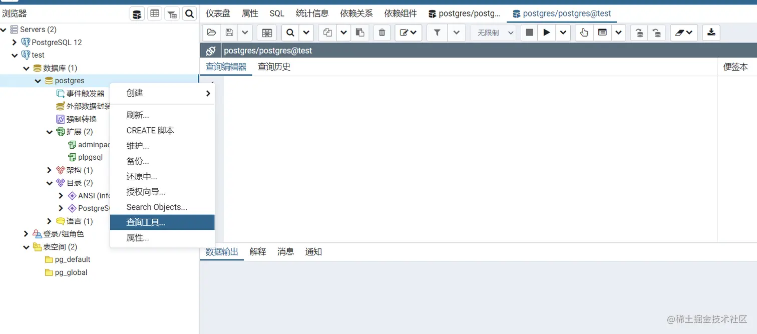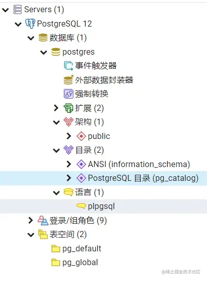 如下,点击pgAdmin的左侧,Servers(会提示输入登陆密码),展开后,会看到PostgreSQL 12及相关的数据库对象。