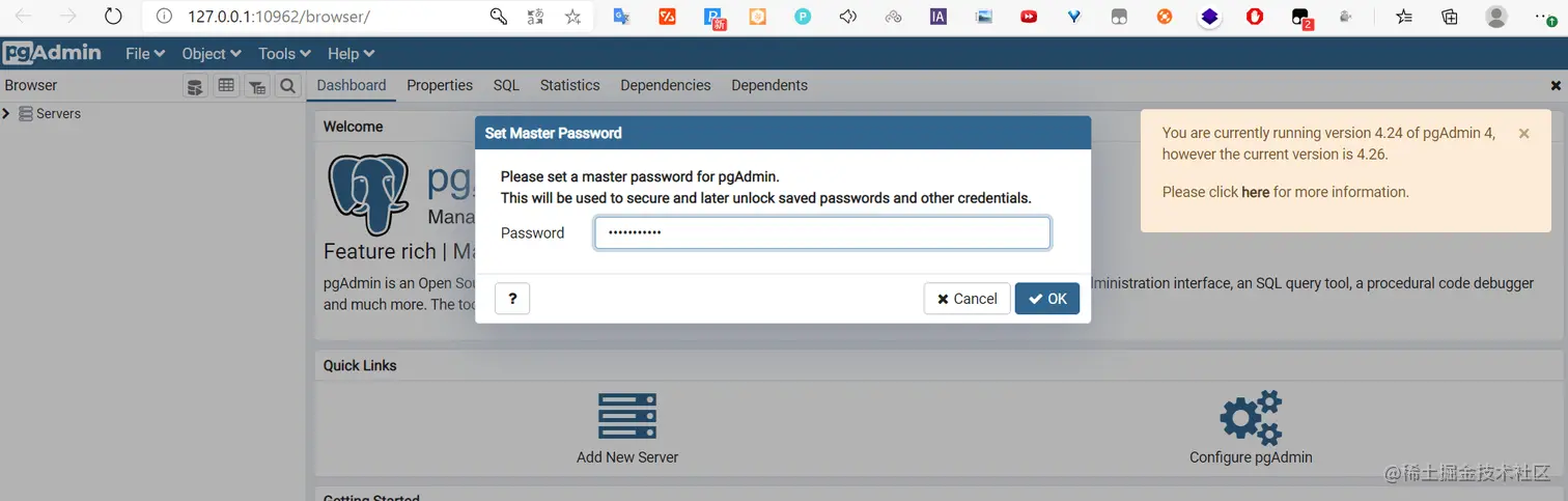 如下,打开pgAdmin 4,程序启动后会在浏览器打开其管理的web页面,输入密码进入。