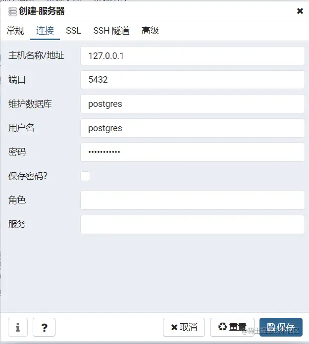 在"连接"中指定主机名或ip地址、端口、数据、用户名和密码。点击"保存"创建并连接到数据库服务器。