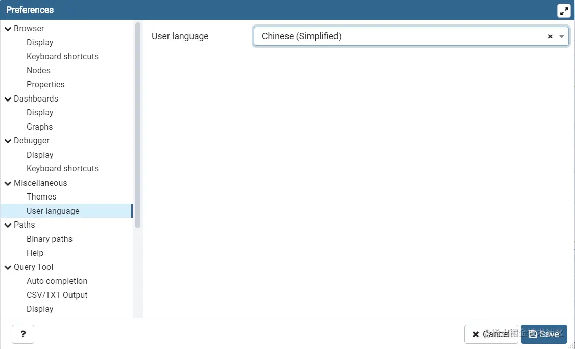 pgAdmin支持多语言界面,默认为英语。但可以改为中文界面,点击“File”下拉菜单,选择“Preferences”;找到左侧列表中的“miscellaneous”(杂项设置) -> “User language”,然后在右侧下拉列表中选项“Chinese (Simplified)”,点击保存。