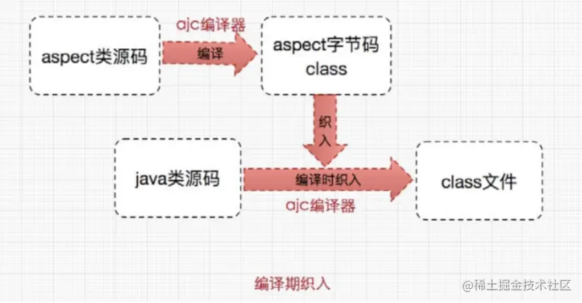 - ApectJ 主要采用的是编译期静态织入的方式。在这个期间使用 AspectJ 的 acj 编译器(类似 javac)把 aspect 类编译成 class 字节码后,在 java 目标类编译时织入,即先编译 aspect 类再编译目标类。