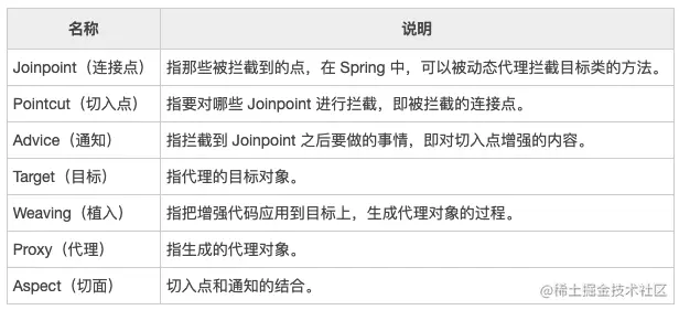 为了更好地理解 AOP,就需要对 AOP 的相关术语有一些了解,这些专业术语主要包含 Joinpoint、Pointcut、Advice、Target、Weaving、Proxy 和 Aspect,它们的含义如下表所示。