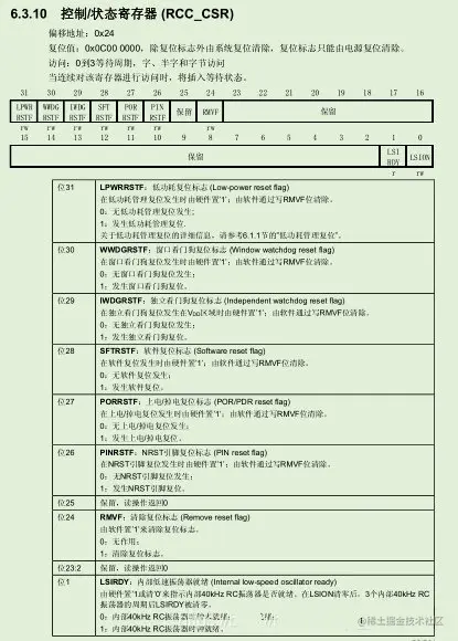 在STM32中文参考手册中可以看到,复位源可以通过状态寄存器来读出。