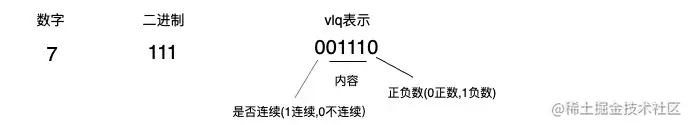 - 一个二进制字节有 8 个位,在 VLQ 编码中设定最高位为是否连续的标识,除了最高位,如果不足 7 个位的倍数则高位补 0;