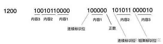 - 对于大数字而言,需要多个单元进行表示,那么如果得知这几个单元属于同一个数字,编码规则设定最高位表示连续性,如果是 1,代表这组字节后面的一组字节也属于同一个数;如果是 0,表示该数值到这就结束了;这就避免了分隔符,如