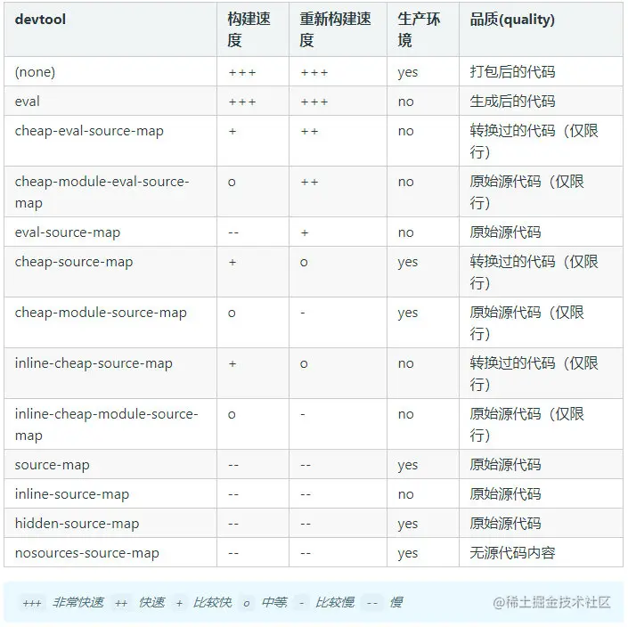 至此,我们`source-map`的五个关键词的学习也就告一段落了,而最开始提到官网给出的二十几种配置无非是选词组合而已,再附送下一些常见配置项的关键参数对比吧。