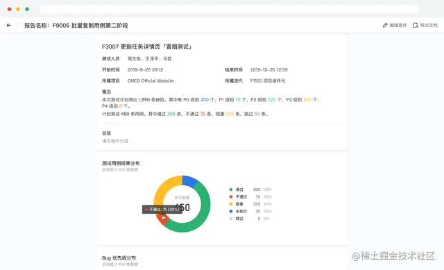 在完成测试计划之后,ONES Testcase可以一键生成测试质量报告,提供不同维度的分析结果。当测试质量报告的维度不能满足管理需求,还可以通过自定义模版的方式方便测试经理进行报告的管理。